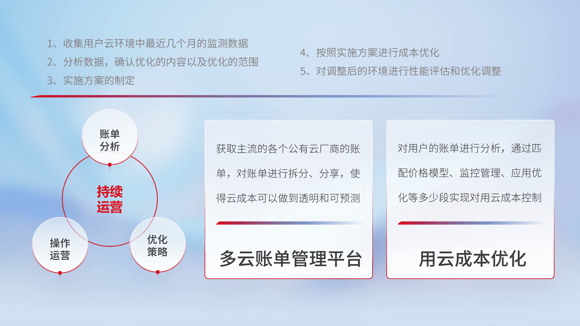 通过多云纳管,,,以统一的资源数据模型把客户的云资源进行抽象和封装,,,,进而实现对多云资源的统一操作,,保障云资源管理的可靠性、、、、稳定性与可用性。。量身定制化运维内容,,,配置、、、开发运维、、、、补丁管理、、、备份、、、监控、、认证和访问管理、、、、审计和日常巡检等,,,保障在用云过程中的可靠度,,,,稳定度以及高可用率。。。