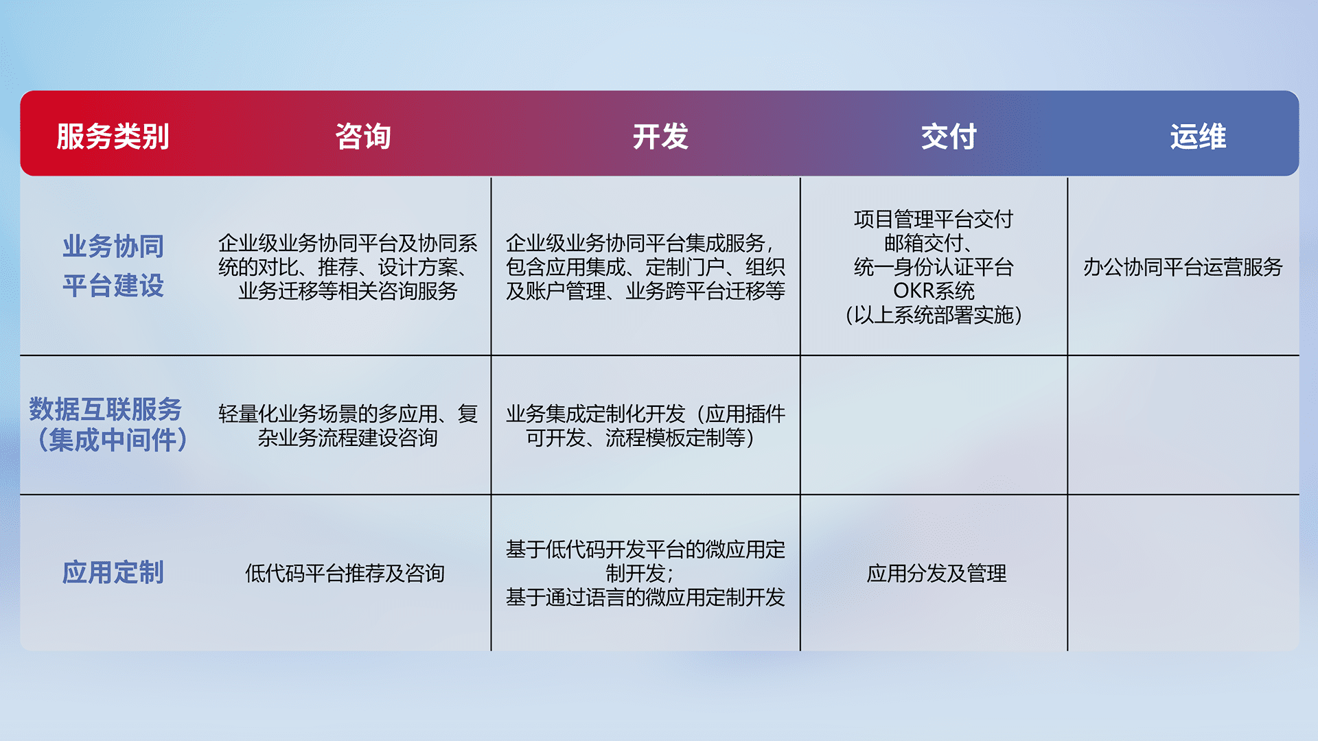 针对钉钉、、、企微、、IDaas等平台级产品提供产品的规划、、方案、、、交付、、定制化开发等服务,,,,实现如统一协同办公、、智能客户服务、、混合会议管理、、智能数据查询、、、、等业务场景,,,,实现数字化转型。。。